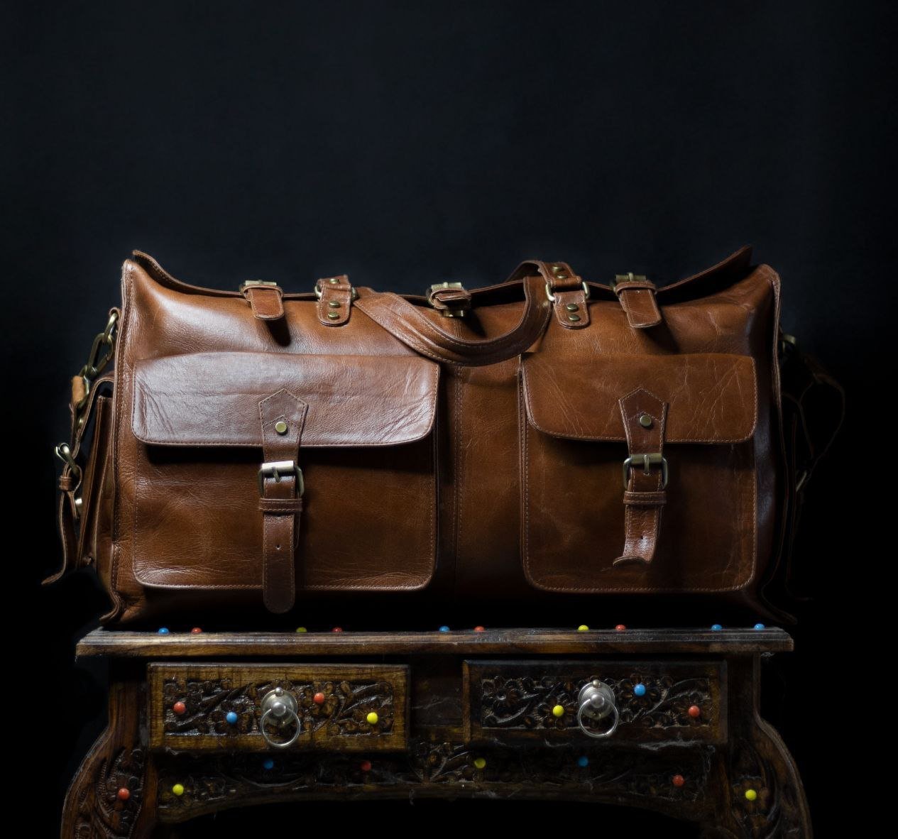 The leather duffle bag with two exterior front pockets and two side pockets is the perfect blend of style and functionality, ensuring you travel with both sophistication and practicality.